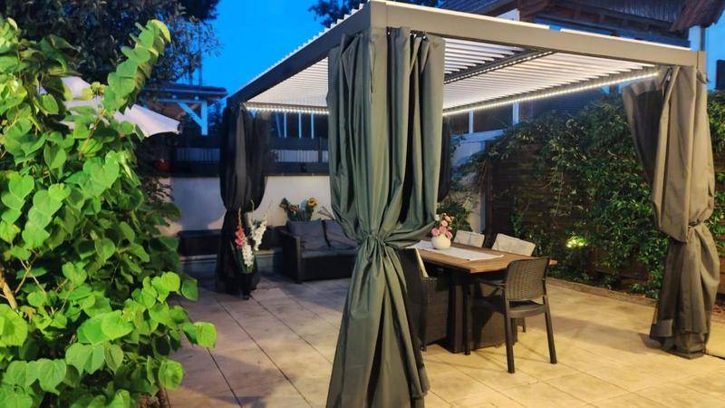 Les baies vitrées vous mènent directement vers la terrasse, la pergola climatique et la piscine hors sol — un espace pensé pour les beaux jours et les moments en famille.