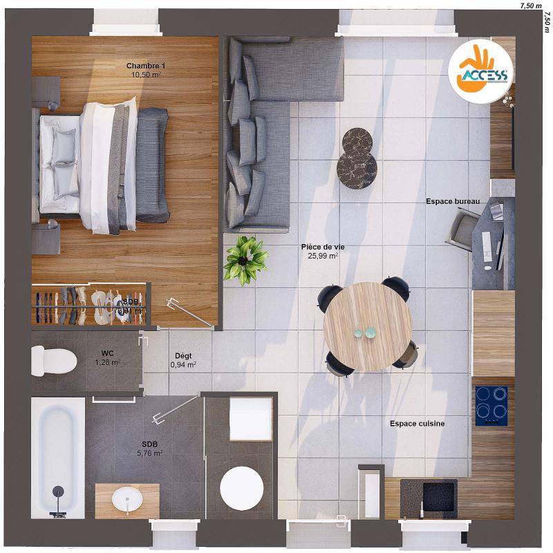 Cette maison de 1 chambre offre une distribution optimisée des pièces sur une superficie de 44 m2 habitable. Ce plan compact a été pensé pour faciliter l'accès à la propriété avec un budget maîtrisé.