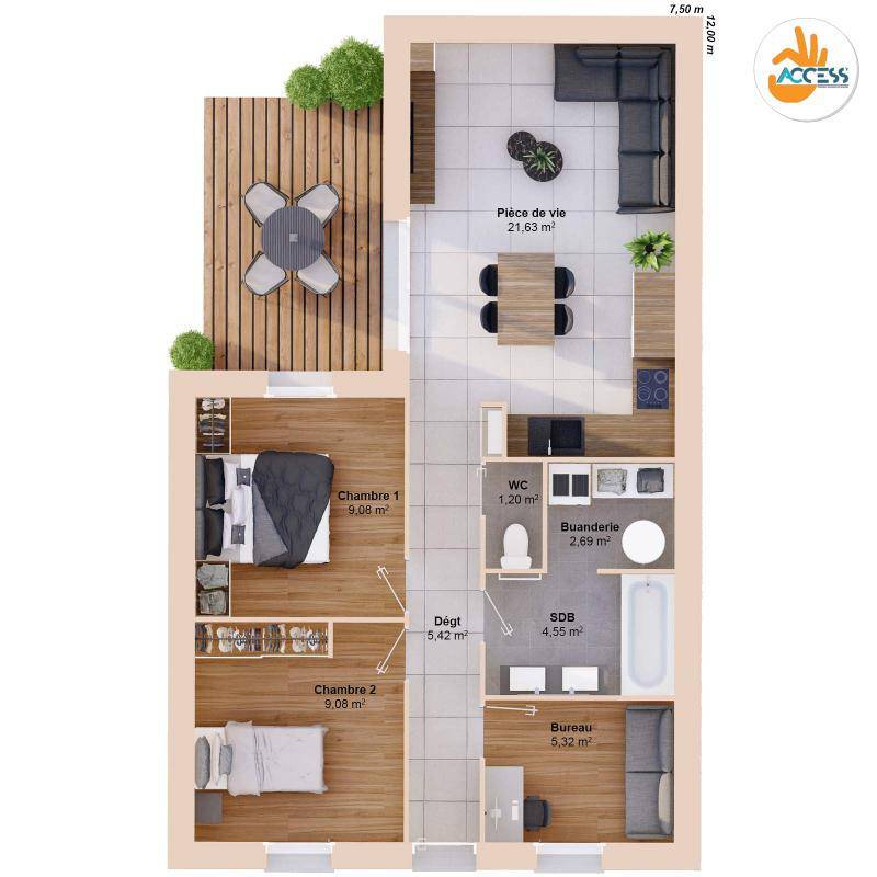 Cette maison de 2 chambres plus un bureau offre une distribution optimisée des pièces et possède toutes les qualités essentielles d'une maison, grâce à son astucieuse pièce "buanderie". Ce plan compact a été pensé pour faciliter l'accès à la propriété avec un budget maîtrisé.