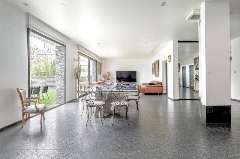 En impasse, maison « d'architecte » de 325m2, qui vous propose sur 2 niveaux: une spacieuse pièce de vie de 99m2 avec placard/dressing sur-mesure, et sa cuisine aménagée et équipée en labradorite (granite avec reflets et en pierres pour bijoux), une pièce de 67m2 abritant une piscine intérieure, au sel, chauffée (4X6m avec extraction d'air traitée, chauffée déshumidifiée, et rejetée en soufflerie en air chaud), 5 chambres (1 suite parentale de 50m2 avec salle de bain (douche et jacuzzi 4 personnes) et dressing et 4 autres chambres de 25m2, 21m2, 20m2 et 16m2 toutes équipées de leur placard/dressing), 2 toilettes suspendus séparés dont un avec lave-mains, une salle de bain de 10m2 en granit flammée avec baignoire d'angle jacuzzi, une salle d'eau de 10m2, un dégagement de 25m2 avec de nombreux rangements, et une buanderie de 5m2.