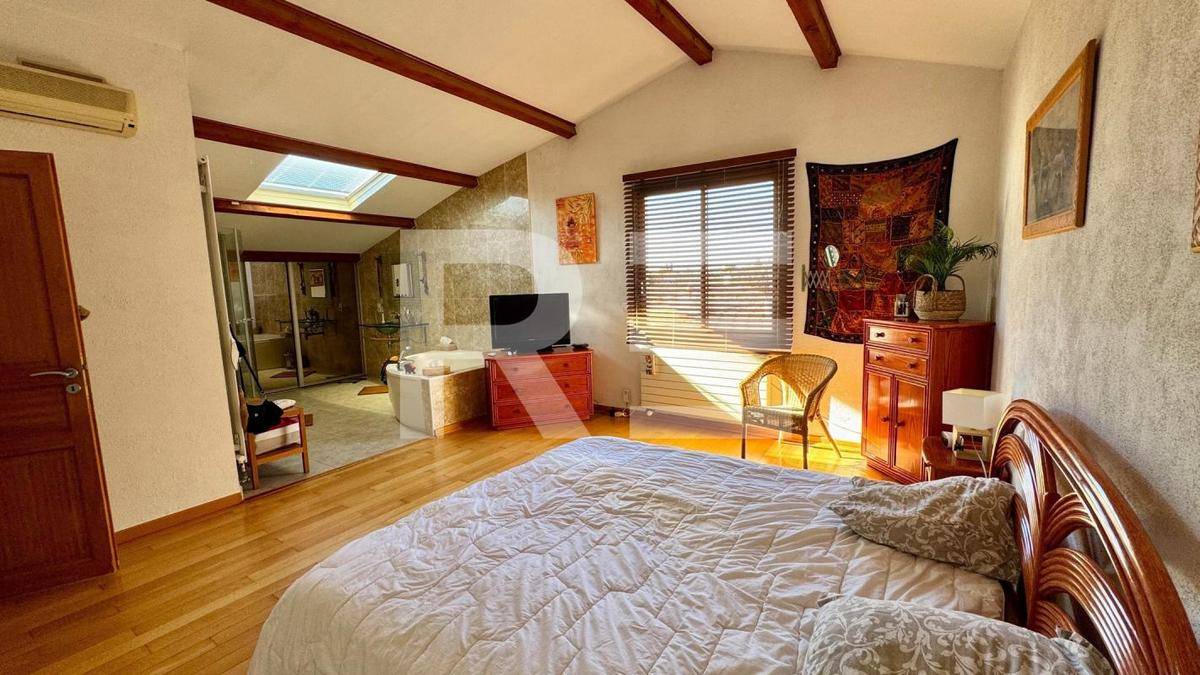 Un hall d'entrée dessert un vaste séjour avec sa sublime cheminée à foyer ouvert en pierre du Pont du Gard. La pièce de vie donne également sur la piscine intérieure baignée de lumière et sur ses belles terrasses en véranda qui sont un véritable second lieu de vie. A droite du hall d'entrée on trouve une grande buanderie qui permet aussi d'accéder au double garage. Sur la gauche, un wc . La grande cuisine/ salle à manger séparée, est aussi très éclairée part de belles baies vitrées qui permettent une très belle vue sur le jardin et un accès direct à une généreuse terrasse extérieure avec sa treille. Depuis la salle à manger une porte s'ouvre sur la partie nuit avec une belle salle de bain puis en descendant trois marches se trouvent deux chambres avec leur mezzanines.