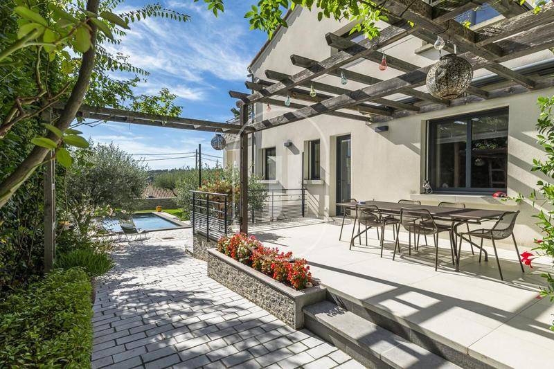 Cette villa à vendre à Villeneuve-lès-Avignon bénéficie de deux terrasses : une terrasse exposée sud d'environ 24 m² et une terrasse est d'environ 30 m² équipée chacune d'un store électrique. Le terrain arboré apporte charme et intimité, tandis que la piscine de 8x3 m promet d'agréables moments de détente en famille ou entre amis.