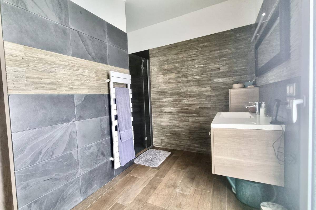 Au rez-de-chaussée, trois chambres, dont deux avec accès direct à un patio, alle de bains spacieuse avec baignoire et douche à l'italienne, buanderie-cellier, WC indépendant. En façade, à l'extérieur de la maison, un débarras pratique vient s'ajouter aux nombreuses prestations de cette maison.