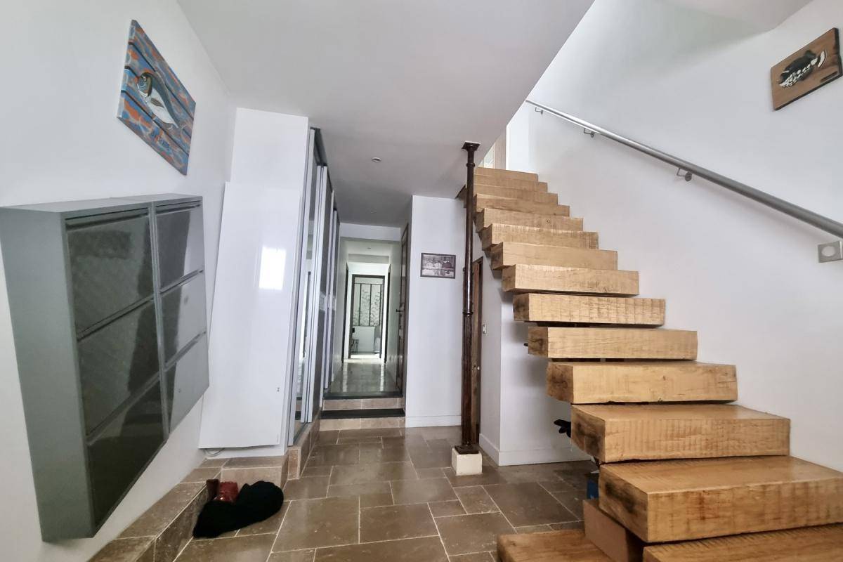 A l'étage, vaste pièce de vie (40 m²) avec salon et salle à manger ouverte sur l'extérieur. La cuisine américaine, équipée d'un plan de travail en Corian, ouvre sur une grande terrasse sans vis-à-vis, où vous pourrez vous détendre dans le jacuzzi en toute intimité. Une suite parentale (dressing et salle d'eau) avec balcon complète ce niveau. WC indépendant. Un magnifique escalier en bois massif, rappelant les traverses de chemin de fer, relie les deux niveaux.