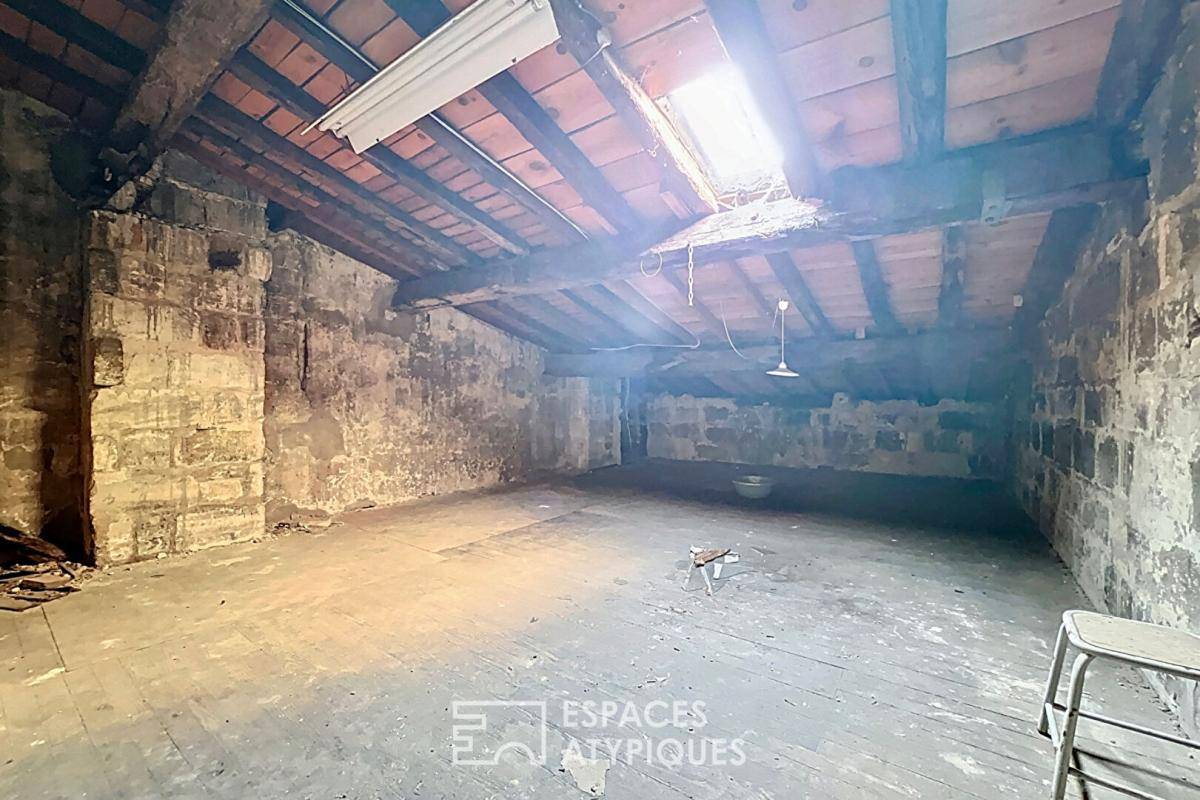 Un escalier en pierre mène à l'étage où se dessinent différents espaces à repenser selon vos envies, tandis qu'un second escalier en bois conduit aux combles aménageables.