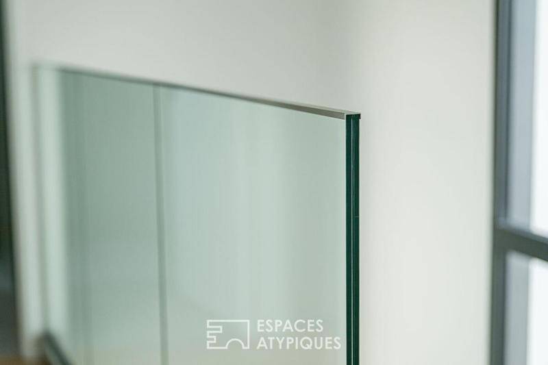 Un bel escalier avec garde corps en verre dessert deux chambres et un bureau se partageant une salle d'eau. Les parents quant à eux bénéficient d'une suite avec dressing et salle de d'eau avec baignoire.