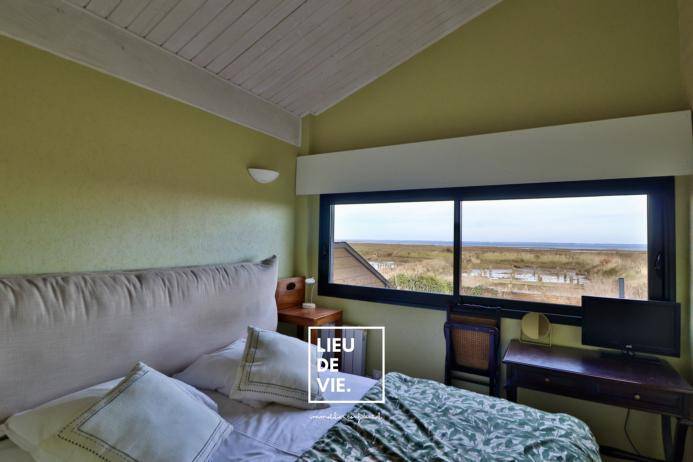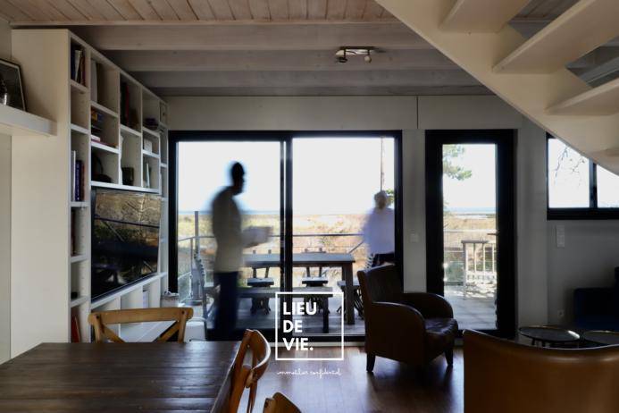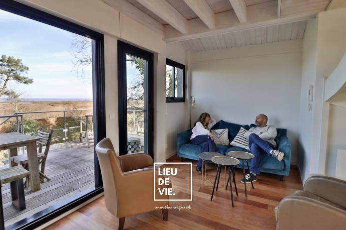 Derrière le portail automatique, se cache un lieu absolument incroyable. Une élégante maison sur pilotis dont l'espace de vie jouit d'une vue incroyable sur le bassin d'Arcachon ainsi que sur la lande à perte de vue, vierge de construction. La vue hypnotique invite au lâcher prise et à la contemplation de cette nature sauvage. Le niveau principal comprend un salon salle à manger et une cuisine américaine réalisée sur mesure par des artisans Italiens, une chambre, un dressing et une salle d'eau.