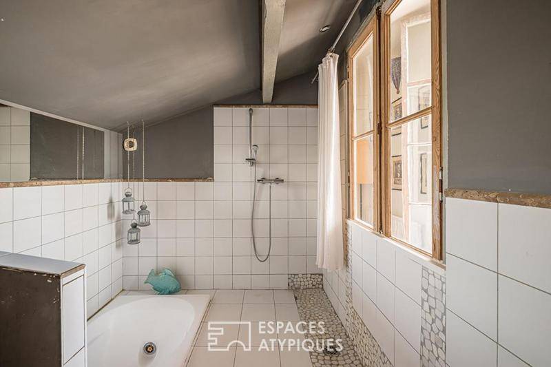 A l'étage, une grande chambre de 44 m² avec vue sur la Garonne et un espace dressing de 13 m² pouvant être transformé en bureau ou en chambre. Une coursive permet d'accéder à la salle de bain avec douche et baignoire, à une seconde chambre et à un WC. Une troisième chambre se trouve en mezzanine.