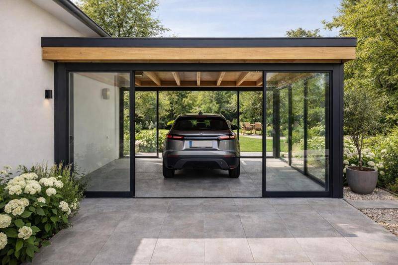 La villa dispose d'un Carport privatif de 17,50 m², offrant un abri sécurisé et esthétique pour votre véhicule, en complément des espaces de rangement de la maison.