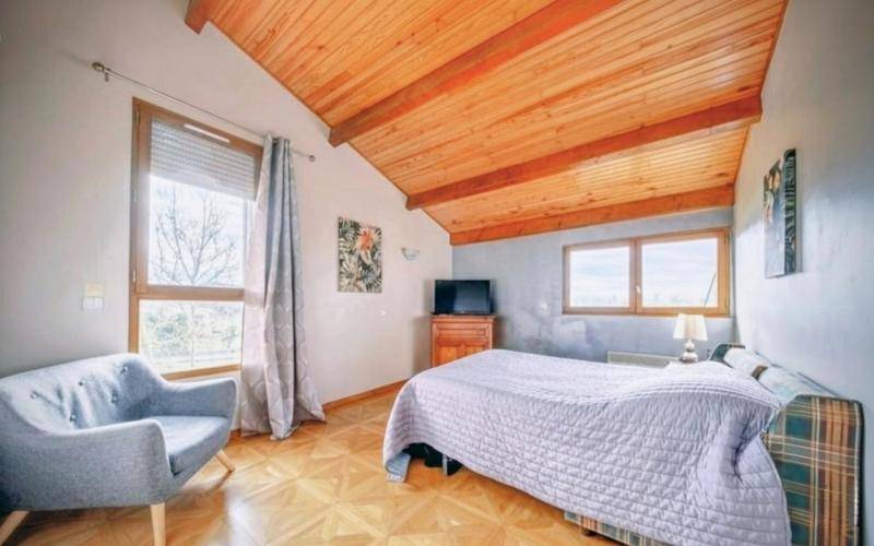 À l'étage : 3 chambres pleines de charme sous des rampants boisés, offrant une atmosphère chaleureuse et une vue dégagée sur le jardin, la campagne et les Pyrénées