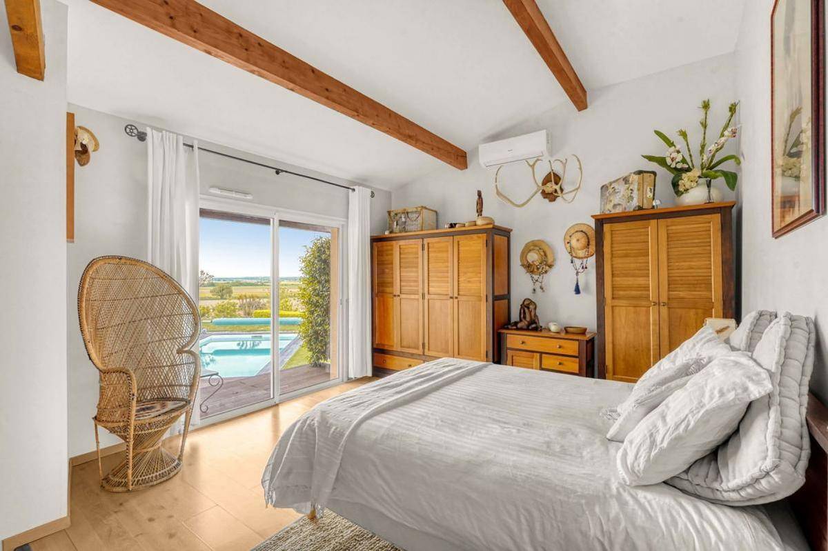 L'espace nuit se compose de trois grandes chambres avec rangements, dont une avec un accès direct à la terrasse et à la piscine, ainsi qu'une belle salle d'eau avec baignoire d'angle et douche à l'italienne. WC indépendant.