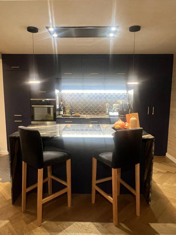 La Cuisine d'Exception : Véritable pièce maîtresse, elle dispose d'un plan de travail/bar en marbre Barocco, une pierre rare qui donne un cachet unique et luxueux à l'espace.