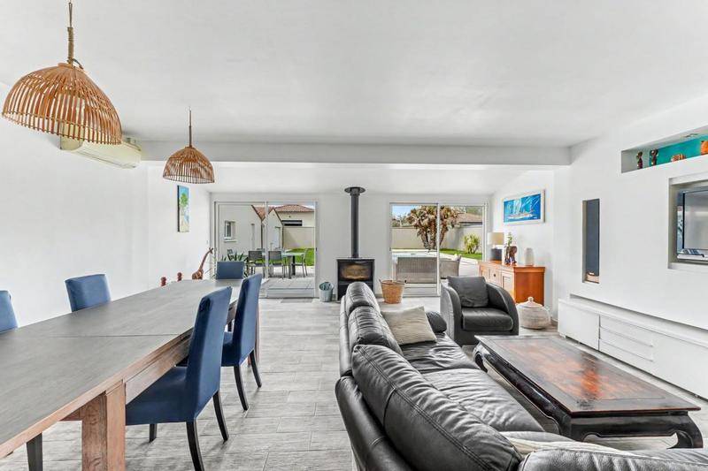 - Une vaste pièce de vie baignée de lumière, où le poêle à bois invite à la détente. De larges ouvertures effacent la frontière entre intérieur et jardin.