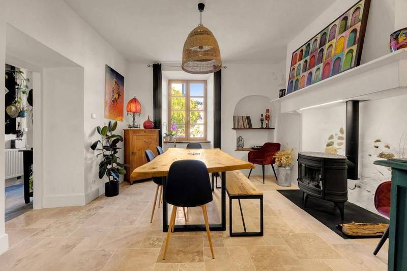 Dès votre arrivée, vous serez charmé par l'authenticité de cette demeure totalement rénovée avec des matériaux de haute qualité, ne nécessitant aucun travaux. Le double vitrage installé partout assure une isolation thermique et phonique optimale. Au rez-de-chaussée, le hall d'entrée révèle un carrelage d'époque restauré qui mène à des pièces de vie lumineuses. La cuisine séparée, moderne et haut de gamme, est une invitation à la convivialité. La salle à manger est réchauffée par un poêle à bois, créant une atmosphère douillette, tandis que le salon intimiste s'ouvre sur la terrasse couverte, idéale pour profiter des extérieurs en toute saison. Le sol en travertin, présent dans la plupart des pièces, ajoute une touche de raffinement incontestable. Ce niveau propose également une vaste salle d'eau avec douche à l'italienne, un W.C. séparé et un cellier-buanderie pratique.