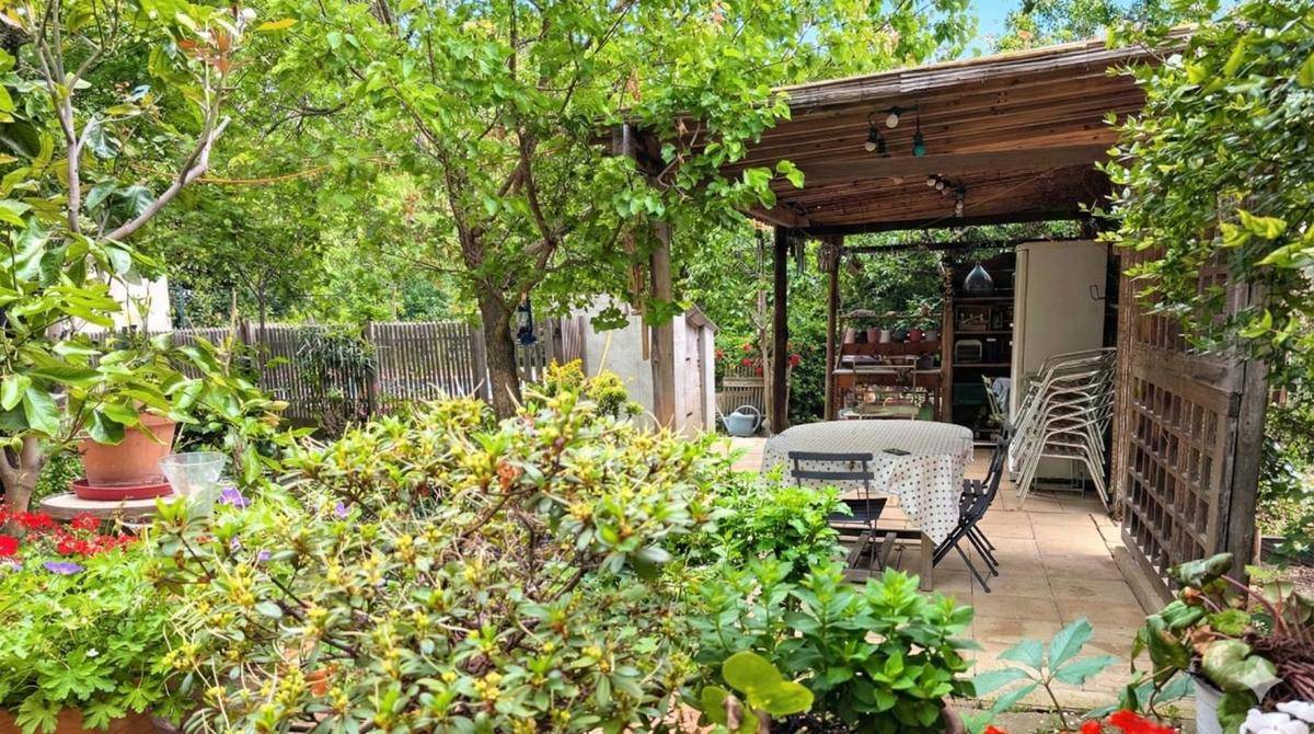 Jardin soigné avec potager, massifs fleuris et arbres fruitiers