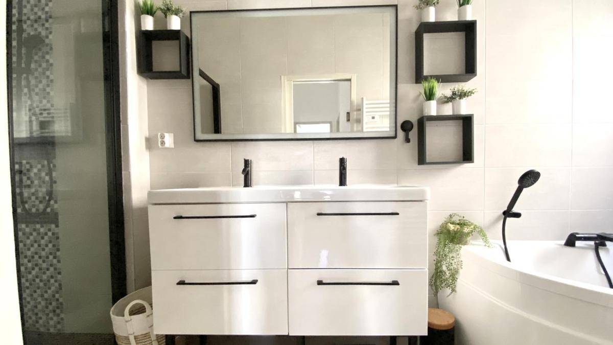 La seconde salle d'eau offre un bel espace avec baignoire d'angle, grande douche à l'italienne et double vasque, complétée par un WC indépendant.