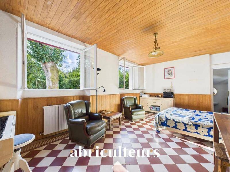 Un couloir mène ensuite à deux autres chambres de plain-pied, dont une de belle dimension, puis, quelques marches plus bas, à un second salon lumineux ouvert sur le jardin arboré.
