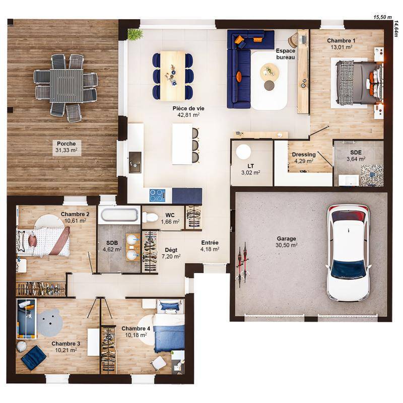 Imaginez votre futur chez-vous, deux fois plus grand : Double garage, deux espaces nuit bien séparés composés de 4 chambres, deux salles de bains, deux grandes baies vitrées ouvertes sur deux terrasses, dont une abritée sous un grand préau idéal pour les journées ensoleillées. Plus de confort, plus de lumière, plus de liberté — toujours accessible avec Maisons Alysia.
