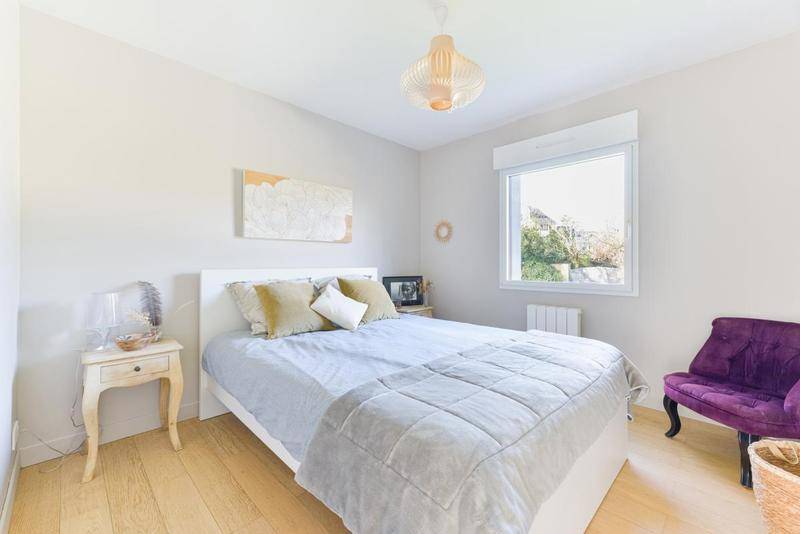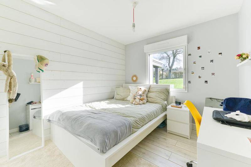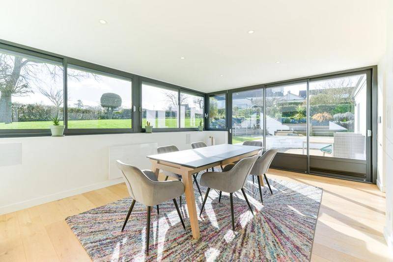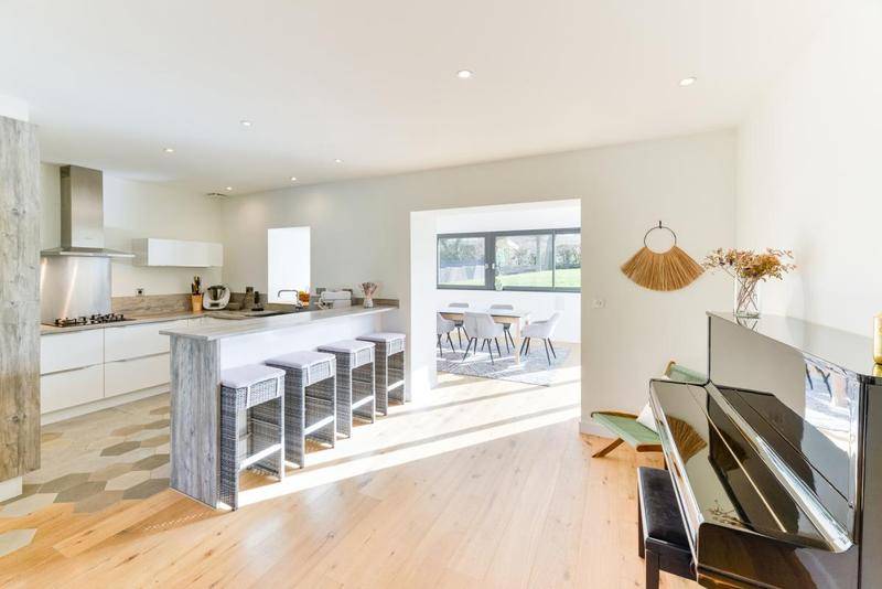 • L'entrée dessert une grande pièce de vie composée d'espaces distincts, dont une cuisine aménagée et équipée, de 4 chambres, d'une salle d'eau, d'un WC séparé, d'un cellier et d'un garage vélo. Le tout sur une parcelle de 1150 m².