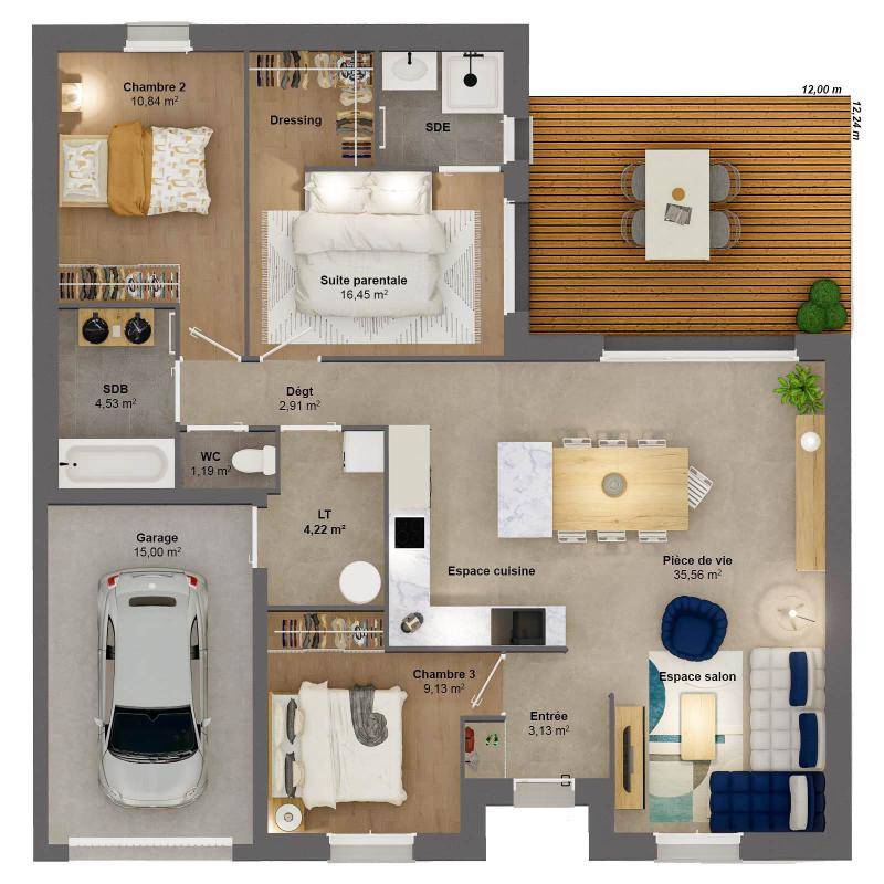 TERRAIN ET MAISONMaison neuve à construire BAOBAB_3CH_98_V2 BELLE MAISON DE 3 CHAMBRES Voyez la vie en double avec cette grande maison.Avec son double garage, ses deux espaces nuits isolés, ses deux salles de bains, ses 2 grandes baies vitrées dans la pièce de vie qui sont prolongées par deux terrasses.Profitez de la vie chez vous en deux fois plus grand ! Vivez votre rêve en ayant deux fois plus de confort toujours avec un cout de construction attractif chez Maisons Alysia. • Lumineuse avec cuisine ouverte donnant sur son jardin. • Beaux volumes et distribution optimisée des pièces pour votre confort de vie. • Aménagements et équipements de haut niveau : volets roulants motorisés et connectés, système de chauffage par pompe à chaleur, domotique, carrelage grand format. ET SI VOUS FAISIEZ CONSTRUIRE AVEC MAISONS ALYSIA ?Testez notre configurateur en ligne et chiffrez instantanément votre projet personnalisé, téléchargeable. • Gratuit, rapide et sans engagement. • + de 250 modèles de maisons personnalisables. • Calculettes en ligne pour identifier votre budget et évaluer votre future mensualité. Rendez-vous sur notre site maisons-alysia(.com) pour concrétiser votre rêve. Contactez-nous au (Numéro supprimé) pour finaliser votre projet ! Coût du terrain inclus dans cette offre. Hors peintures et faïence, revêtements de sol des chambres. Hors assurance dommages-ouvrage, frais de notaire et frais d’adaptation du terrain éventuels.Cette offre est proposée en collaboration avec notre partenaire foncier selon disponibilités. Contact : au (Numéro supprimé).