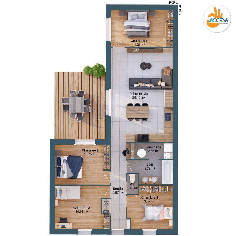 Cette maison de 4 chambres offre une distribution optimisée des pièces et possède toutes les qualités essentielles d'une maison, grâce à son astucieuse pièce "buanderie". Ce plan compact a été pensé pour faciliter l'accès à la propriété avec un budget maîtrisé.