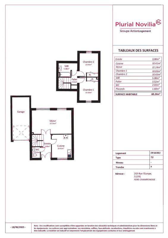 MAISON203 rue de l’Europe à Fère-Champenoise, maison type 3 de 68 m² env., comprenant : entrée, séjour, cuisine, WC ; à l’étage : 2 chambres avec placard, salle de bain. Garage. Terrain de 202 m². Taxe foncière : 758 euros.Montant estimé des dépenses annuelles d’énergie pour un usage standard : entre 1190E et 1640E par an. Prix moyens des énergies indexés sur l’année 2023 (abonnements compris)Vente ouverte à titre de résidence principale. Visites sur RDV, renseignements et dépôt des dossiers complets en contactant le commercialisateur. Délais de remise des offres prioritaires : 1 mois à compter de la dernière annonce légale. Remise des offres : par mail uniquement. Offre et prix soumis à condition de ressources. Les délais de remise de offres, priorités des candidatures, le prix et les conditions de ressources relèvent de de l’article L443-11 et suivants du CCH. Frais de notaire réduits et pas de frais de notaire pour les cataires PLURIAL NOVILIA.