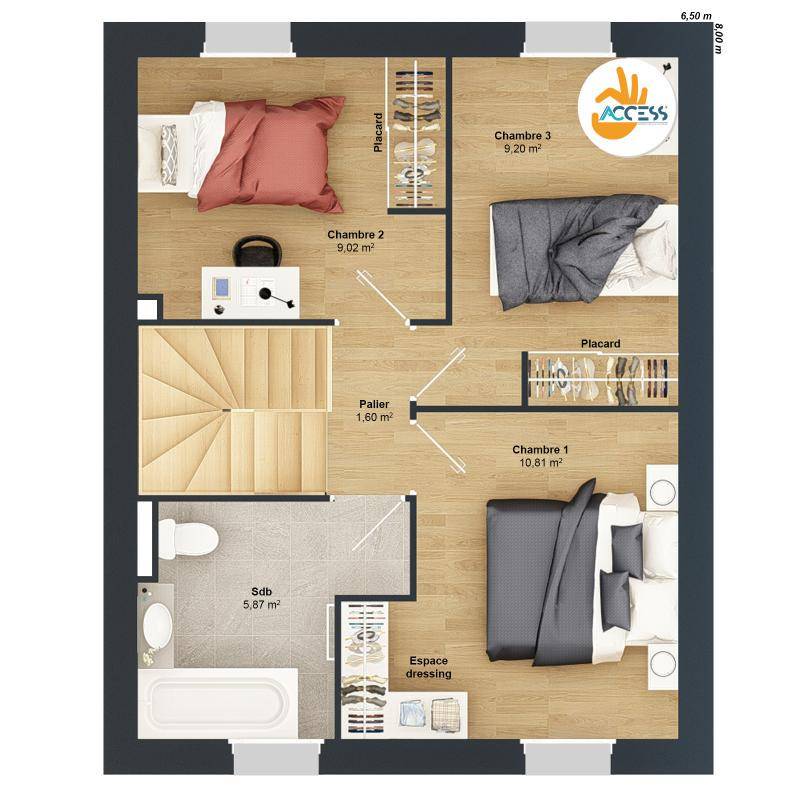 Cette maison de 3 chambres offre une distribution des pièces optimisée au service de la vie de famille. Elle présente une belle pièce de vie conviviale dont une cuisine spacieuse et fonctionnelle au rez-de-chaussée, ce qui permet de dissocier confortablement la partie nuit qui se situe à l'étage. En plus de sa pièce de vie lumineuse, elle propose un bel espace bureau, idéal pour du télétravail et un dressing dans chaque chambre. Ce plan a été pensé pour faciliter l'accès à la propriété à un budget maîtrisé.