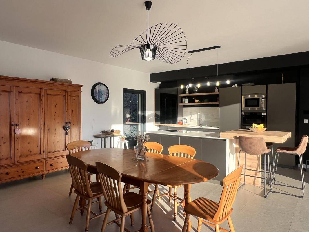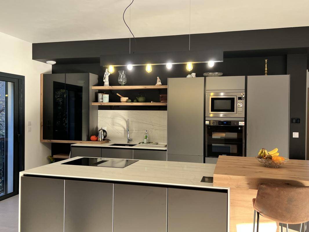 La cuisine américaine, aménagée et entièrement équipée, s'intègre harmonieusement à l'espace pour une atmosphère conviviale et élégante.