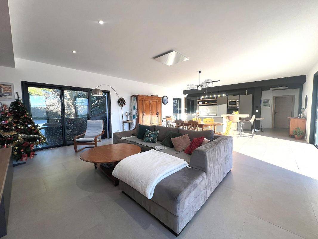 Dès l'entrée, vous serez séduit par la grande pièce de vie sublimée par des baies vitrées à galandage, ouvrant sur la terrasse et sa superbe piscine Bali.
