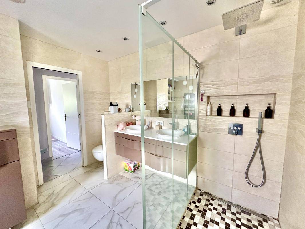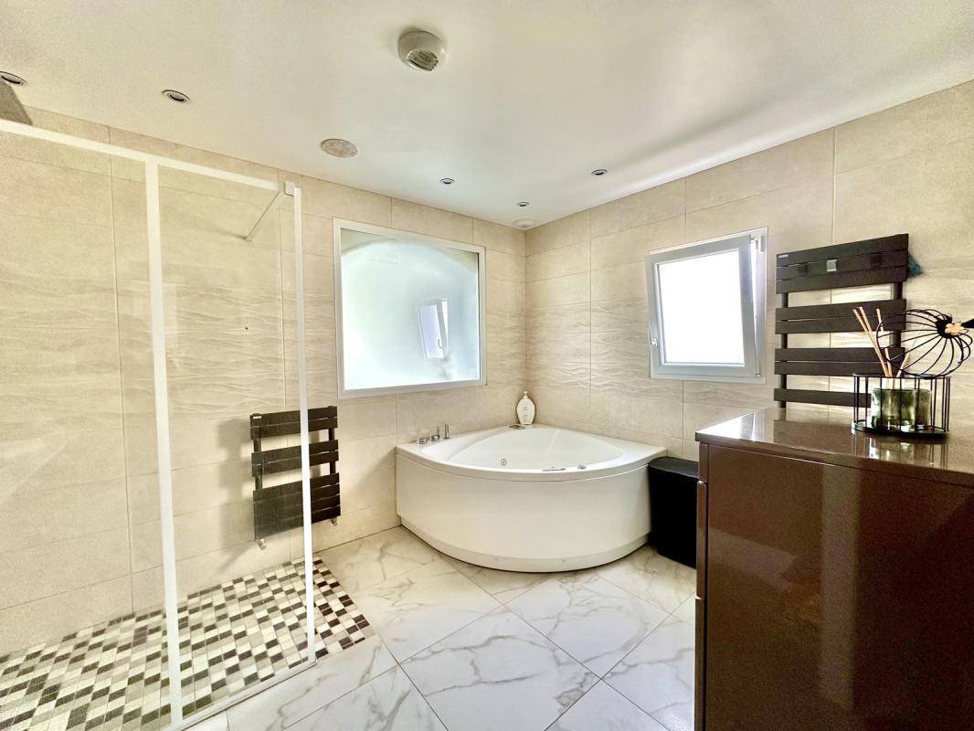 Vous profiterez également d'un terrain d'environ 1500m2 entièrement clos, d'une piscine chauffée de (10X4m) avec dôme amovible, d'un sous sol total carrelé (aménagé de 3 pièces de 41m2, 28m2 et 26m2, et d'un espace garage de 27m2), d'un double garage de 30 m² avec porte motorisée accès terrasse et côté jardin, de 5 places de stationnement, d'une cour pavée, de 2 terrasses surélevées carrelées « effet pierres » dont une de 50m2, de 2 box de 25 m² chacun sous une des terrasses suspendues, d'un système de chauffage par pompe à chaleur air/ eau avec climatisation réversible, de panneaux solaires photovoltaïques et des prestations de qualité (extérieurs soignés, pierres, garde-corps en fer forgé, bananiers, oliviers, fibre optique, alarme, portail motorisé, visiophone, volets roulants électriques, domotique, fenêtres oscillo-battantes en aluminium, portes à galandage, salle de bains, cuisine, stores électriques intérieurs 3 positions, etc…).