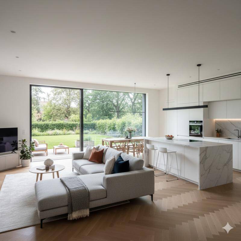 Le rez-de-chaussée propose une belle pièce de vie lumineuse avec cuisine ouverte, prolongée par une terrasse et un jardin privatif, ainsi que des espaces fonctionnels parfaitement intégrés.