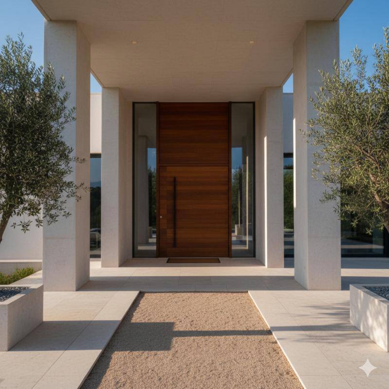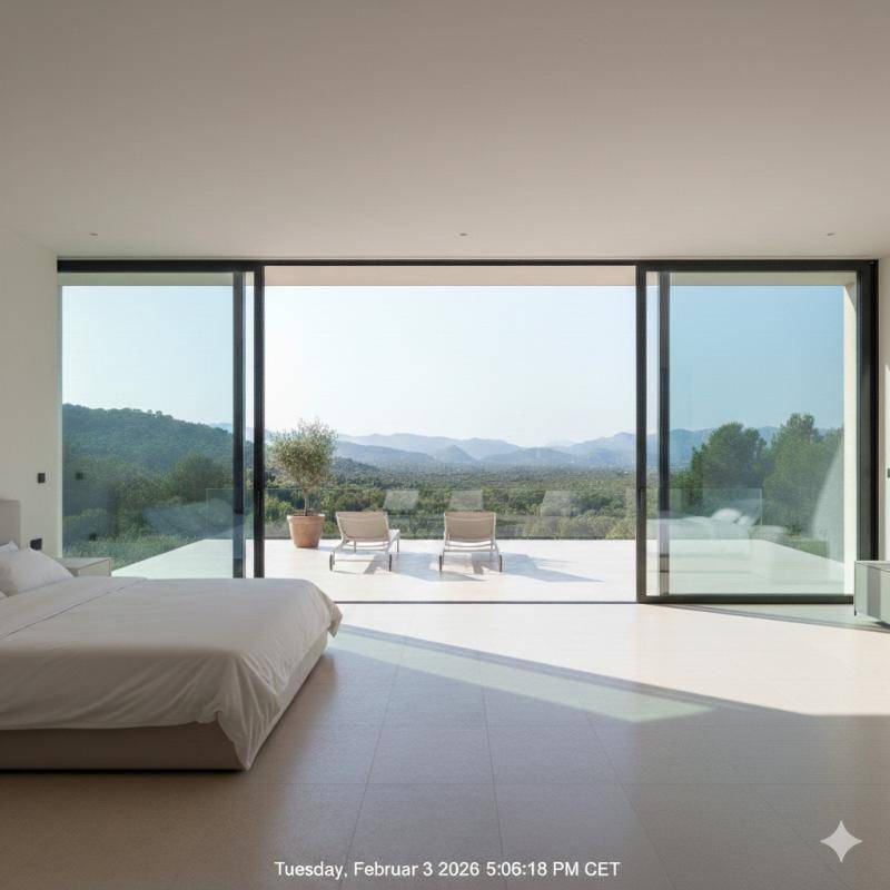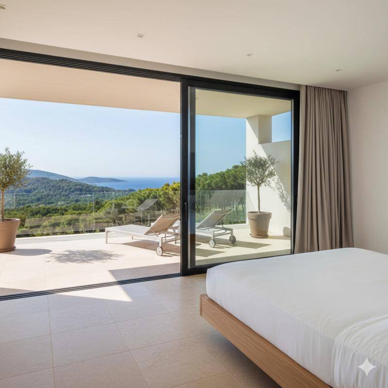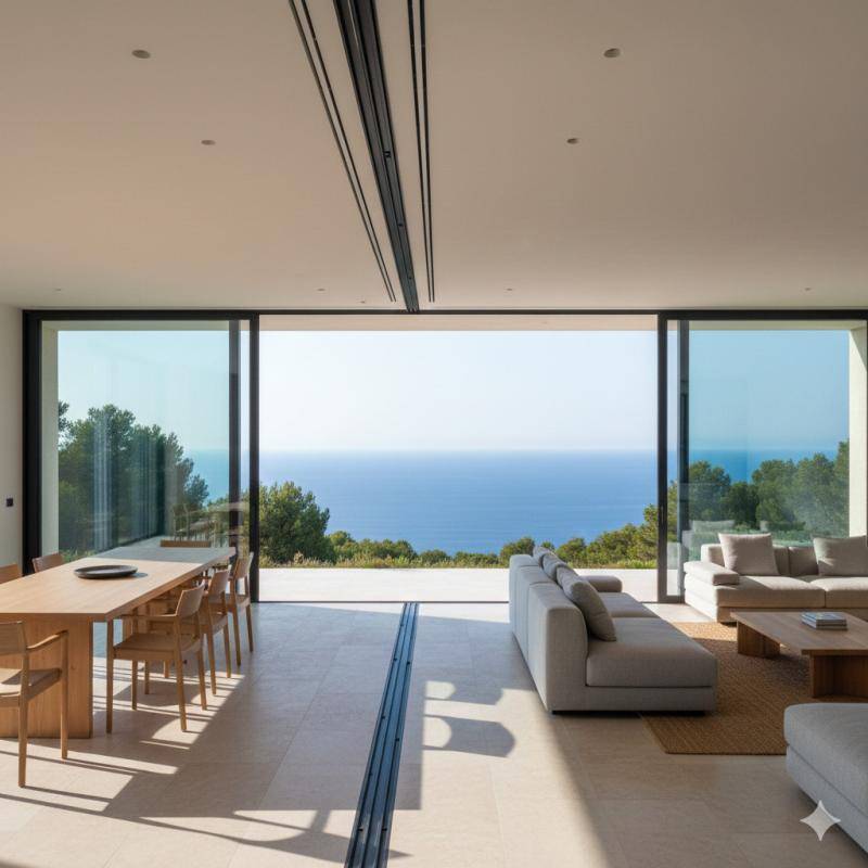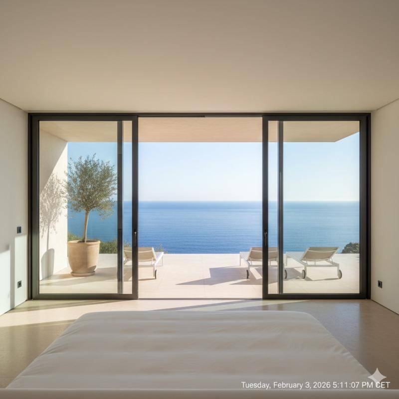 Floor-to-ceiling windows dissolve the boundary between indoors and outdoors, flooding the interiors with natural light and framing sweeping Mediterranean views.