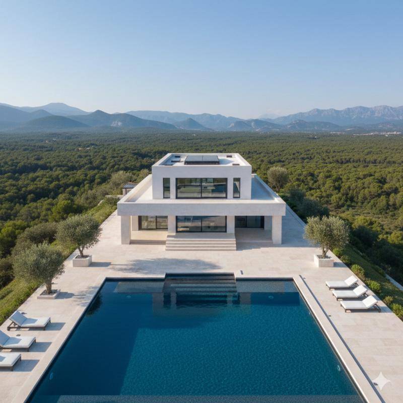 Érigée sur une parcelle d'environ 4 785 m², cette villa contemporaine offre près de 600 m² habitables, prolongés par de vastes terrasses, des annexes haut de gamme et un environnement paysager préservé.