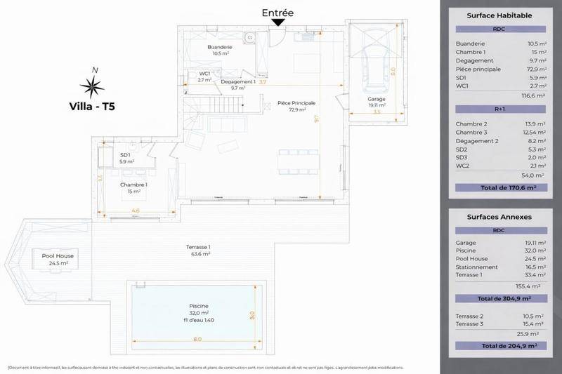 TERRAIN ET MAISONLe Lavandou La Fossette – Villa contemporaine 5 pièces avec piscine et double garage GFP Immobilier vous propose, dans le quartier très recherché de La Fossette au Lavandou, cette villa contemporaine neuve développant 144,20 m² habitables sur une parcelle d’environ 661 m², à proximité des plages et dans un environnement résidentiel privilégié. La maison se compose au rez-de-chaussée d’une vaste pièce de vie d’environ 64 m² largement ouverte sur les terrasses grâce à de grandes baies vitrées, d’une chambre avec salle d’eau et d’un WC indépendant. À l’étage, vous trouverez trois chambres supplémentaires, deux salles d’eau, un WC indépendant ainsi que plusieurs terrasses offrant des espaces extérieurs complémentaires. Les espaces de vie se prolongent sur une terrasse principale d’environ 59 m² donnant sur le jardin paysager et la piscine privative d’environ 24,5 m². La propriété dispose également d’un garage double d’environ 39,7 m² ainsi que d’un stationnement extérieur. La villa bénéficie de prestations contemporaines conformes à la réglementation thermique en vigueur, avec menuiseries aluminium double vitrage, volets roulants électriques centralisés, carrelage grand format, chauffage et climatisation par système air/air, chauffe-eau thermodynamique et VMC hygroréglable. Située dans un secteur calme et recherché du Lavandou, cette propriété offre un cadre de vie rare sur le littoral varois. Pour tout renseignement complémentaire ou pour organiser une visite, contactez GFP Immobilier, votre spécialiste du secteur du Lavandou et de Bormes-les-Mimosas.