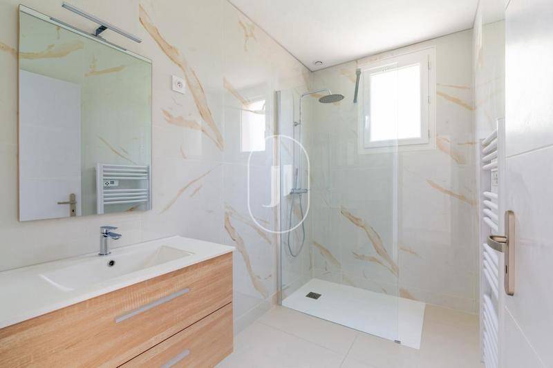 D'une surface généreuse, la villa propose cinq chambres en suite, dont une en rez-de-chaussée, idéales pour accueillir famille et invités dans un confort optimal. La pièce de vie, baignée de lumière naturelle grâce à de grandes ouvertures, offre un vaste salon avec cuisine ouverte de 40 m² (cuisine à aménager selon vos goûts), prolongeant harmonieusement les espaces intérieurs vers l'extérieur.