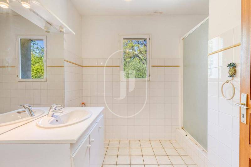 MAISONCe domaine rare à vendre près de Lorgues s’épanouit dans un écrin de nature préservée, au cœur de six hectares de parc harmonieusement paysagé. Chaque arbre, chaque sentier semble avoir été placé avec soin, offrant des vues imprenables sur les collines et paysages aux alentours. Deux villas au charme singulier s’y dressent, alliant authenticité et raffinement. La maison principale, d’environ 240 m² sur deux niveaux, séduit par sa lumière et ses matériaux nobles. Le vaste séjour de 60 m², orienté plein sud, s’ouvre sur une terrasse dominant la piscine. L’atmosphère y respire l’art de vivre méditerranéen : un insert réchauffe le salon, la cuisine au charme provençal se distingue par son évier en marbre et son four à pizza niché dans la pierre. Une pièce attenante, modulable en atelier ou salon d’hiver, complète cet espace convivial. À l’étage, une chambre avec accès terrasse et salle d’eau habillée de carreaux de Salernes signés Alain Vagh. En rez-de-jardin, trois chambres dont une somptueuse suite parentale avec double salle de bains aux teintes éclatantes. Bureau, buanderie et vaste garage de 70 m² complètent cet ensemble autant fonctionnel qu’inspirant. À l’extérieur, la piscine au sel, chauffée et équipée d’un volet solaire, invite à la détente dans un cadre paisible. Plus loin, la seconde villa d’environ 100 m², esprit loft, séduit par sa charpente culminant à plus de 4 mètres, sa cuisine ouverte, son poêle à bois et ses volets coulissants en bois brut. Deux chambres se partagent une salle d’eau, tandis qu’une échelle de meunier mène à un grenier aménageable en dortoir, idéal pour les enfants. Conçue dans ses moindres détails, la propriété allie charme et autonomie : alimentée par l’eau de ville, elle dispose aussi d’un forage de 100 mètres et d’un réservoir tampon. Le chauffage associe pompe à chaleur et insert, garantissant confort et performance énergétique. Les extérieurs complètent ce cadre d’exception : deux box à chevaux, annexes prêtes à être aménagées en chambres d’hôtes, abri bois, atelier, espace de rangement, un garage à vélos et un boulodrome.Grâce à notre partenariat exclusif avec Knight Frank, leader mondial de l’immobilier de prestige, Janssens Immobilier offre à chaque propriété une visibilité internationale exceptionnelle. Cette alliance renforce notre expertise locale par la puissance d’un réseau présent dans plus de 50 pays. Les informations sur les risques auxquels ce bien est exposé sont disponibles sur le site Géorisques : (Lien supprimé) Conformément à la réglementation en vigueur, la surface DPE de ce bien est établie sur la base d’un mesurage normé de la surface habitable. Ce mesurage peut différer de la surface totale mesurée avec précision par nos équipes commerciales.