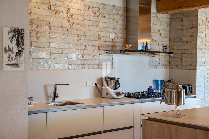 Dès l'entrée, les volumes, la luminosité et la noblesse des matériaux subjuguent. La pièce de vie de 90 m², aux plafonds cathédraux et baies à galandage, s'ouvre plein sud sur près de 200 m² de terrasses qui ceinturent la maison. Le salon s'anime, aux soirées d'hiver, autour d'un insert qui diffuse une chaleur douce et enveloppante. La cuisine italienne, d'un design très haut de gamme, séduit par ses façades de verre au toucher de velours et son plan de travail en quartz, et se complète d'une arrière-cuisine-buanderie avec accès indépendant, ouvrant sur la vue imprenable des collines et du village perché.