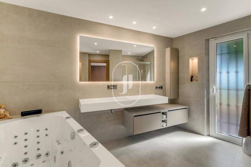Au niveau inférieur, accessible depuis l'intérieur, s'étendent environ 180 m² dédiés aux loisirs et aux prestations de prestige : salle de sport, bureau-bibliothèque, cave à vin climatisée et vaste garage pouvant accueillir jusqu'à quatre voitures.