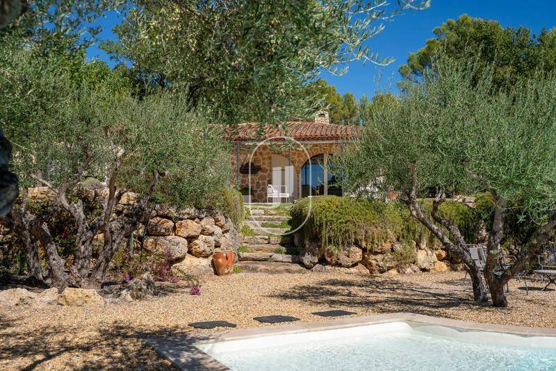 À l'extérieur, le jardin paysager, ponctué d'oliviers centenaires, abrite une piscine au sel de 11 x 6 m, lovée dans un cadre idyllique et totalement préservé.