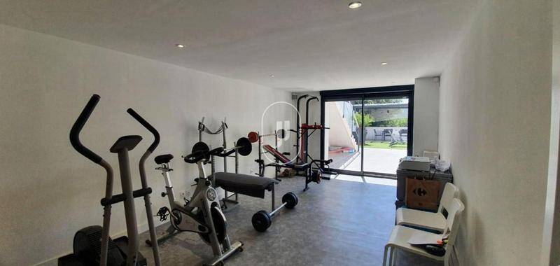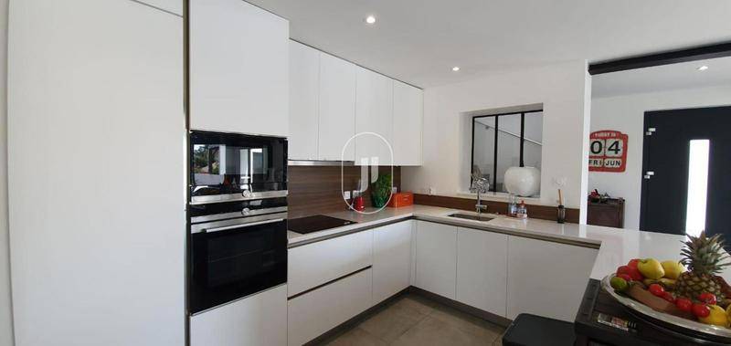 Le séjour, très lumineux, agrémenté de quelques pierres apparentes, s'ouvre sur une cuisine moderne entièrement équipée, le tout prolongé par de vastes terrasses et un élégant jardin d'agrément. Celui-ci est harmonieusement aménagé autour d'une piscine chauffée à fond plat, bordée d'une pelouse synthétique, avec un espace barbecue abrité et une façade claire et soignée. Le jardin est orné de palmiers.