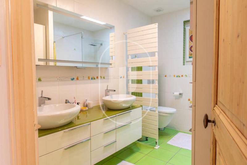 Au rez-de-jardin, une entrée discrète ouvre sur un vaste séjour lumineux de près de 43 m², agrémenté d'une cheminée centrale et largement ouvert sur deux terrasses – l'une au sud de 15 m², l'autre à l'est de 26 m² – pour profiter pleinement de la vue et du climat. La cuisine à vivre, spacieuse et très bien équipée, s'étend sur 17,6 m². L'espace nuit propose deux chambres climatisées, dont l'une avec salle d'eau privative, un bureau avec escalier en pierre, une salle d'eau avec WC, ainsi qu'un WC séparé.
