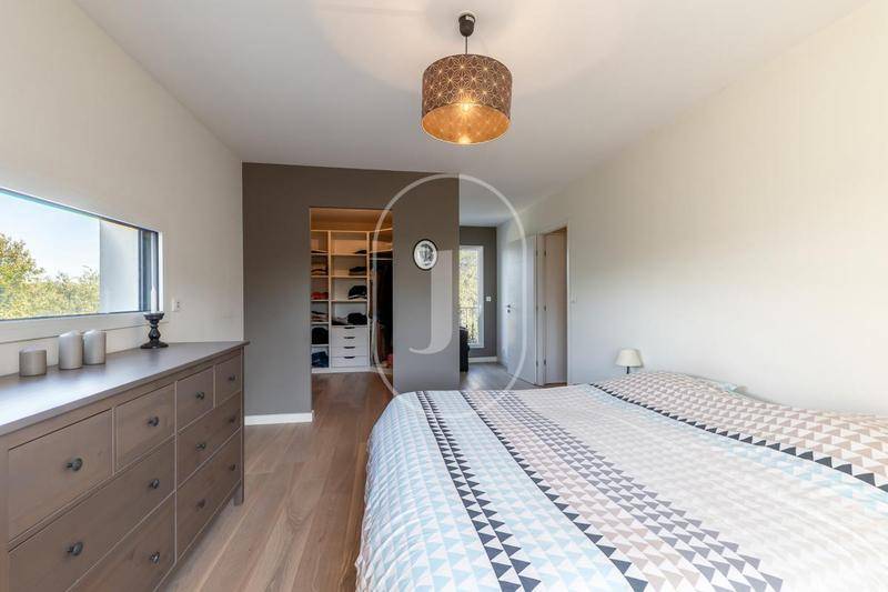 Au rez-de-chaussée, une grande pièce de vie baignée de lumière naturelle vous accueille grâce à de grandes baies vitrées. Elle se compose d'un salon, d'une salle à manger avec cuisine ouverte entièrement équipée, d'une buanderie, d'un bureau, d'un hall, d'un WC indépendant. Ce niveau est complété par un bureau et une chambre avec salle d'eau privative. À l'étage, vous trouverez une chambre parentale avec dressing, deux chambres confortables qui se partage un dressing, une salle de bain, et un WC supplémentaire, offrant des espaces parfaits pour toute la famille.