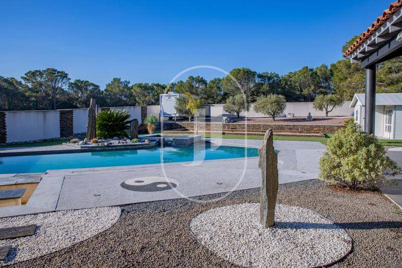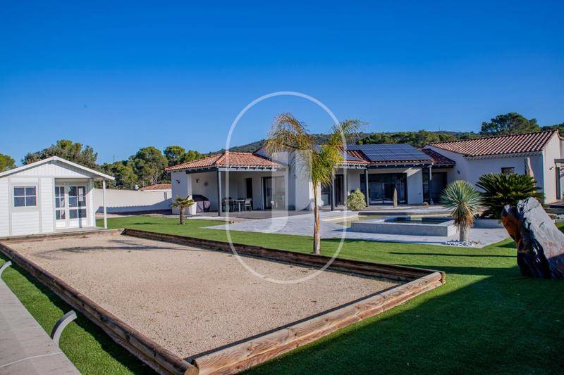 Les extérieurs proposent de vastes terrasses couvertes, un terrain de boule éclairé et un jardin avec arrosage goutte à goutte. La piscine au sel est équipée d'un contrôle automatique du pH et intègre un spa chauffé. Un chalet poolhouse de qualité Grosfillex complète cet espace. Le garage de 39 m², avec porte automatique, dispose d'un rangement en mezzanine et d'une pièce supplémentaire. La maison est raccordée à l'eau de ville, à la fibre et équipée d'une microstation récente.