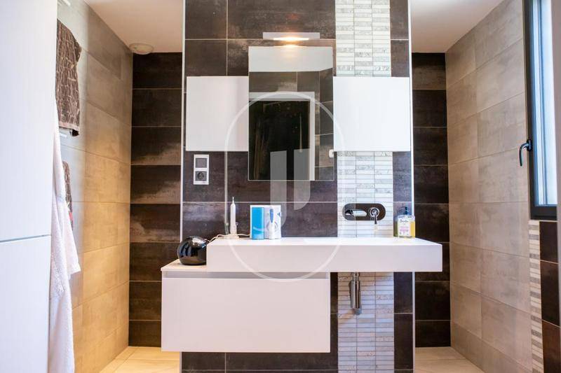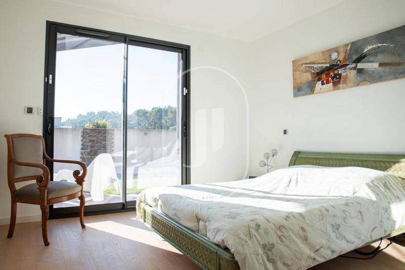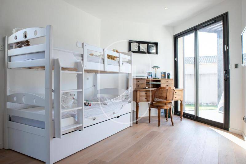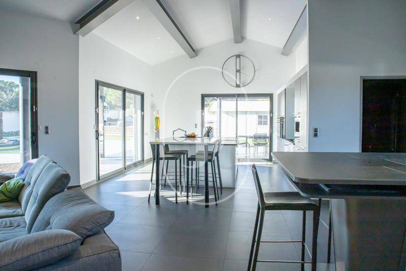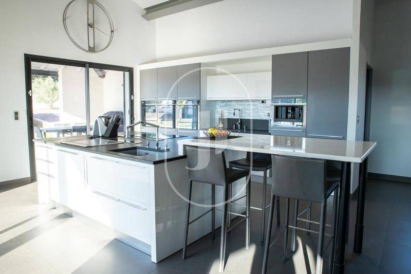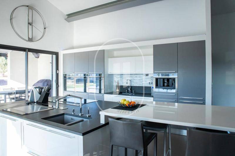 L'intérieur offre une organisation fonctionnelle et élégante, avec de nombreux rangements intégrés et des prestations de qualité supérieure. La pièce de vie impressionne par son volume et sa luminosité exceptionnelle, grâce à de larges ouvertures sur l'extérieur. Elle s'ouvre sur une cuisine contemporaine haut de gamme, équipée d'un plan de travail en quartz et d'un système de double hotte aspirante au sol, alliant esthétisme et discrétion. Un cellier aménagé et une buanderie équipée avec accès direct au jardin complètent l'ensemble.