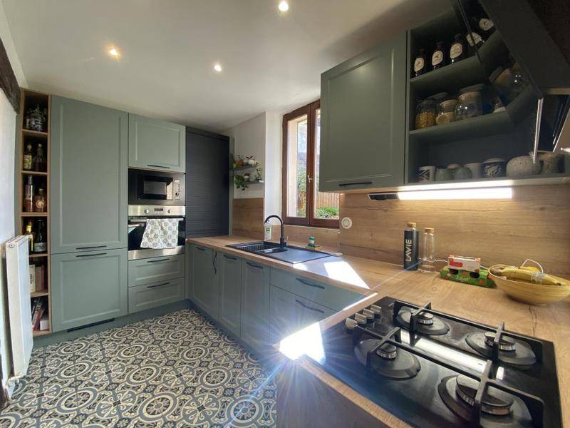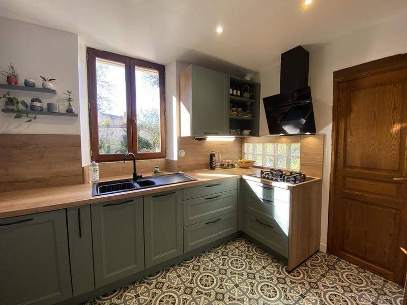 Le rez-de-chaussée dévoile une vaste pièce à vivre , organisée autour d'un salon chaleureux agrémenté d'un poêle à bois et d'une salle à manger conviviale. L'ensemble est ouvert sur une cuisine aménagée et équipée neuve, spacieuse et moderne, qui séduit par son agencement fonctionnel et ses finitions actuelles. Ce niveau comprend également , un WC indépendant et un accès direct au jardin.