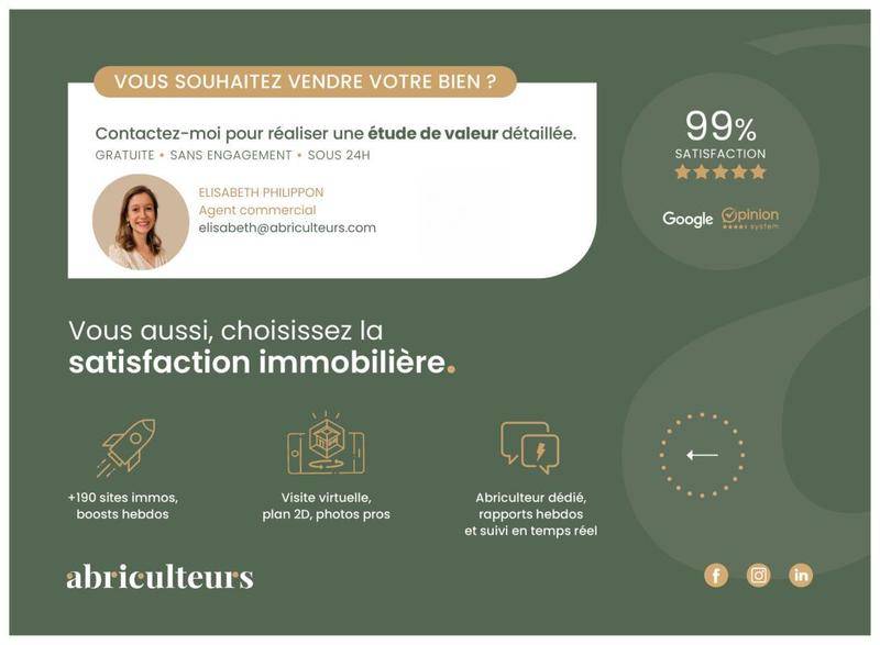 Annonce rédigée sous la responsabilité éditoriale de Mme Elisabeth PHILIPPON, agent commercial (EI), immatriculée au RSAC de Versailles sous le n° 995 324 779, sans détention de fonds, agissant pour le compte de la SARL Abriculteurs immobilier, au capital de 5 000 €, immatriculée sous le SIREN n° 837 704 584, titulaire de la carte professionnelle n° CPI 7501 2018 000 025 842 délivrée par la CCI de Paris Île-de-France, dont le représentant légal est M. Adrien Piot, ayant son siège social au 12 rue des Halles, 75001 Paris.