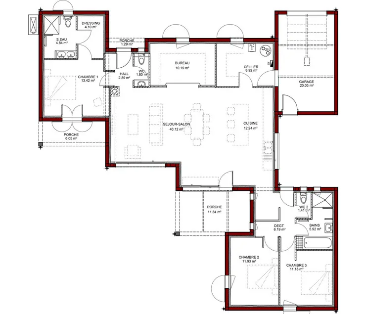 Le projet comprend une maison de 135 m² composée d'un séjour très lumineux de 52 m² avec cuisine ouverte, un bureau et 3 chambres dont une suite parentale avec salle d'eau et dressing, un cellier, une salle de bain, WC séparé et un garage de 20 m².