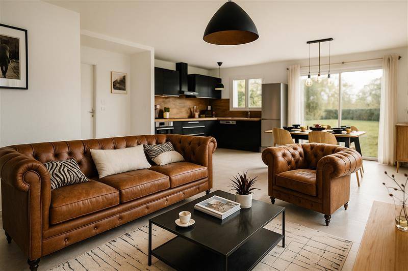Maison de 100 m² avec grande pièce de vie moderne et lumineuse, cuisine ouverte, 4 chambres etjardin. Cadre de vie idéal pour la famille. Contact : (Numéro supprimé)